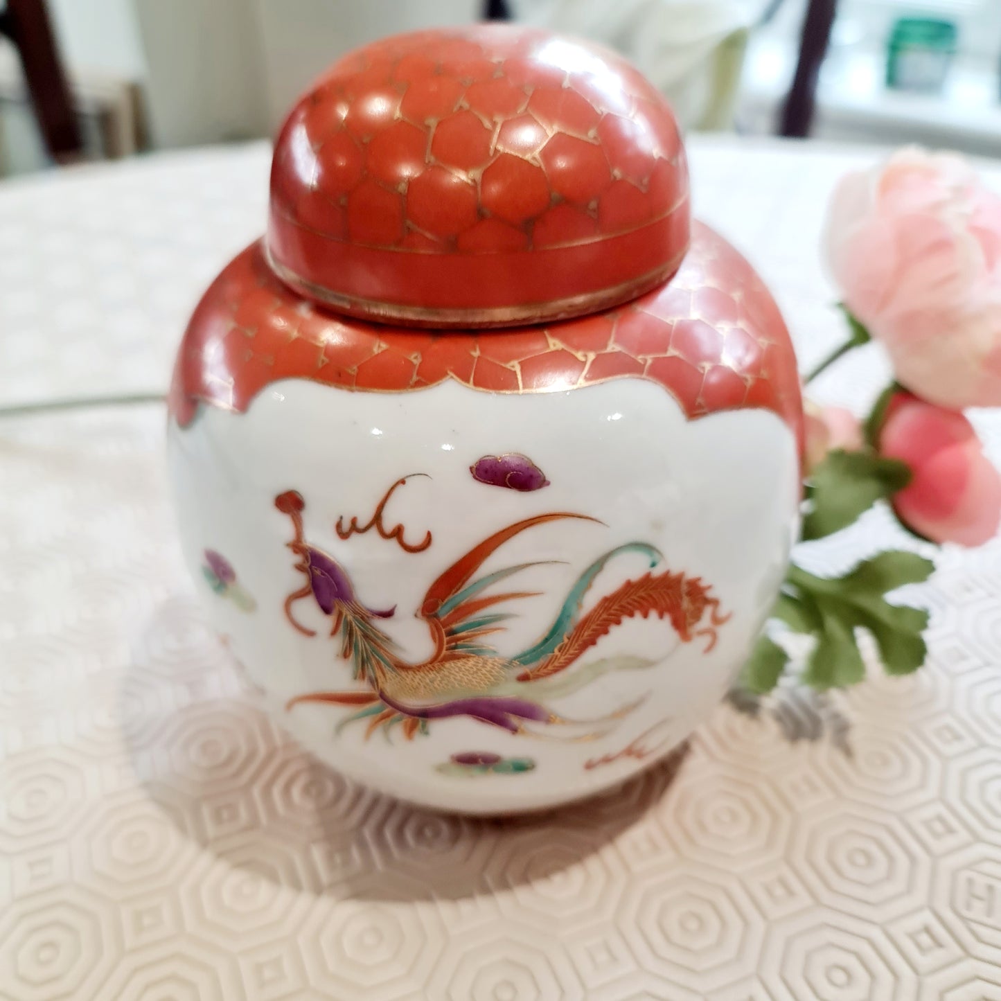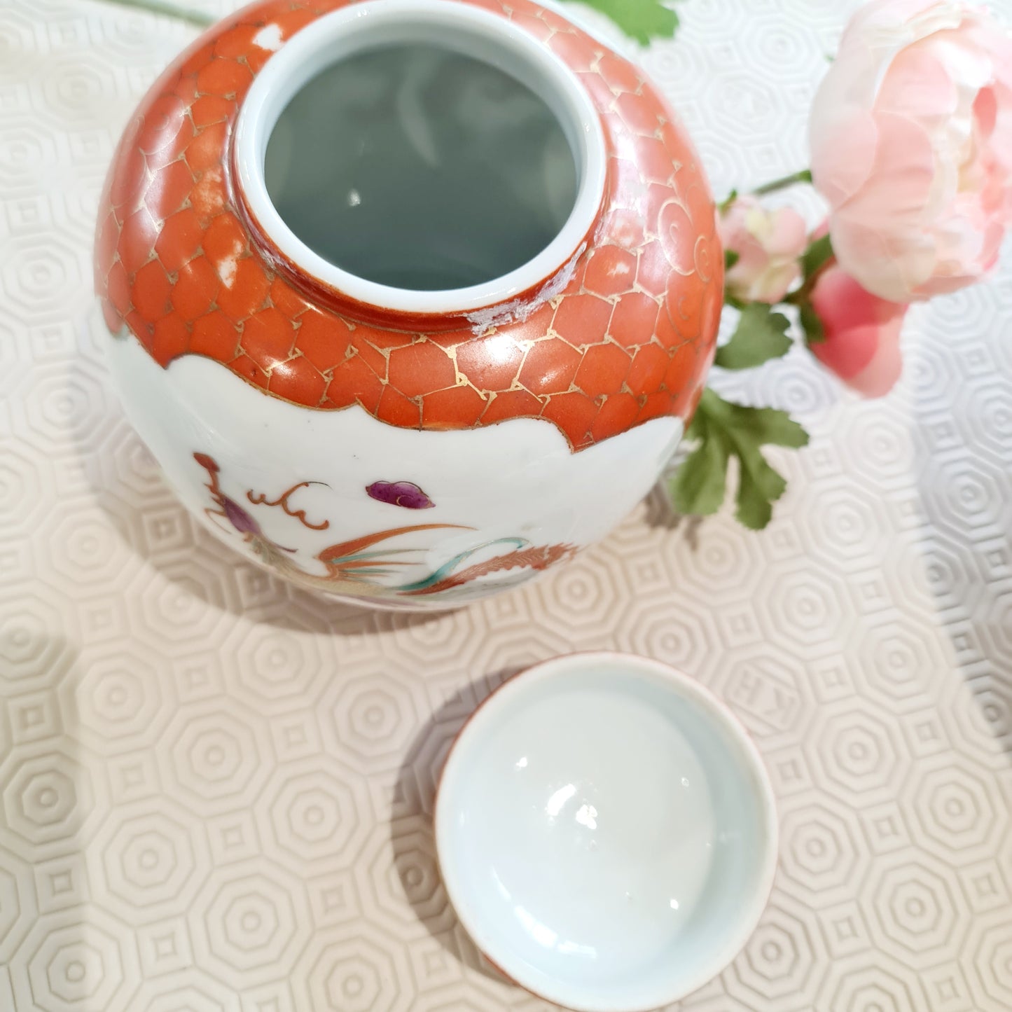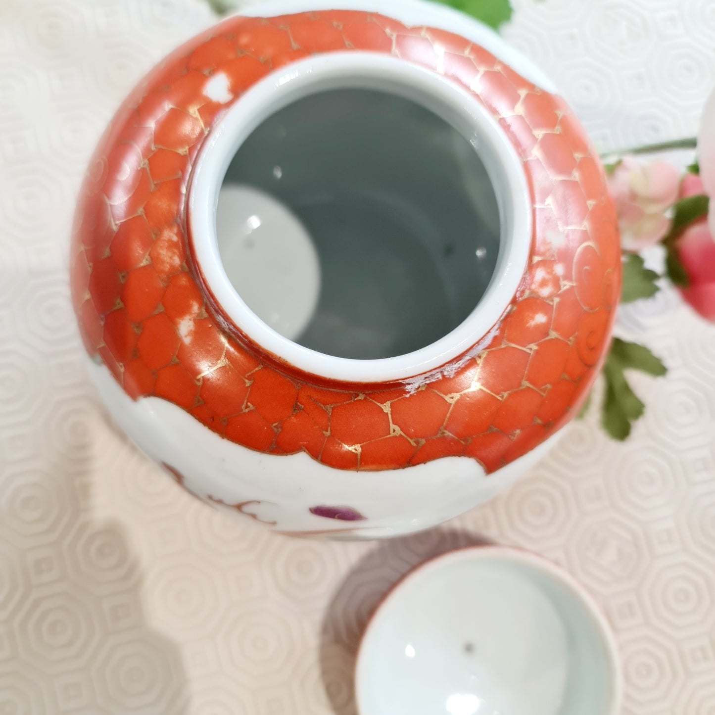 The jar is all hand painted and features a dragon with flaming pearl and a rising Phoenix. All with a dragon scale design in red and gold.