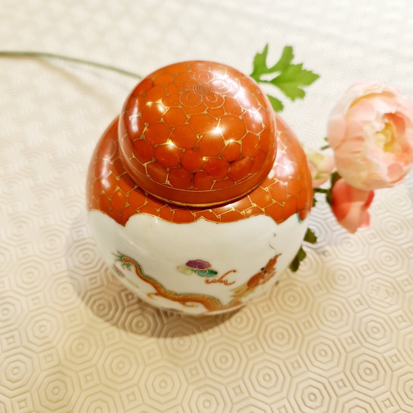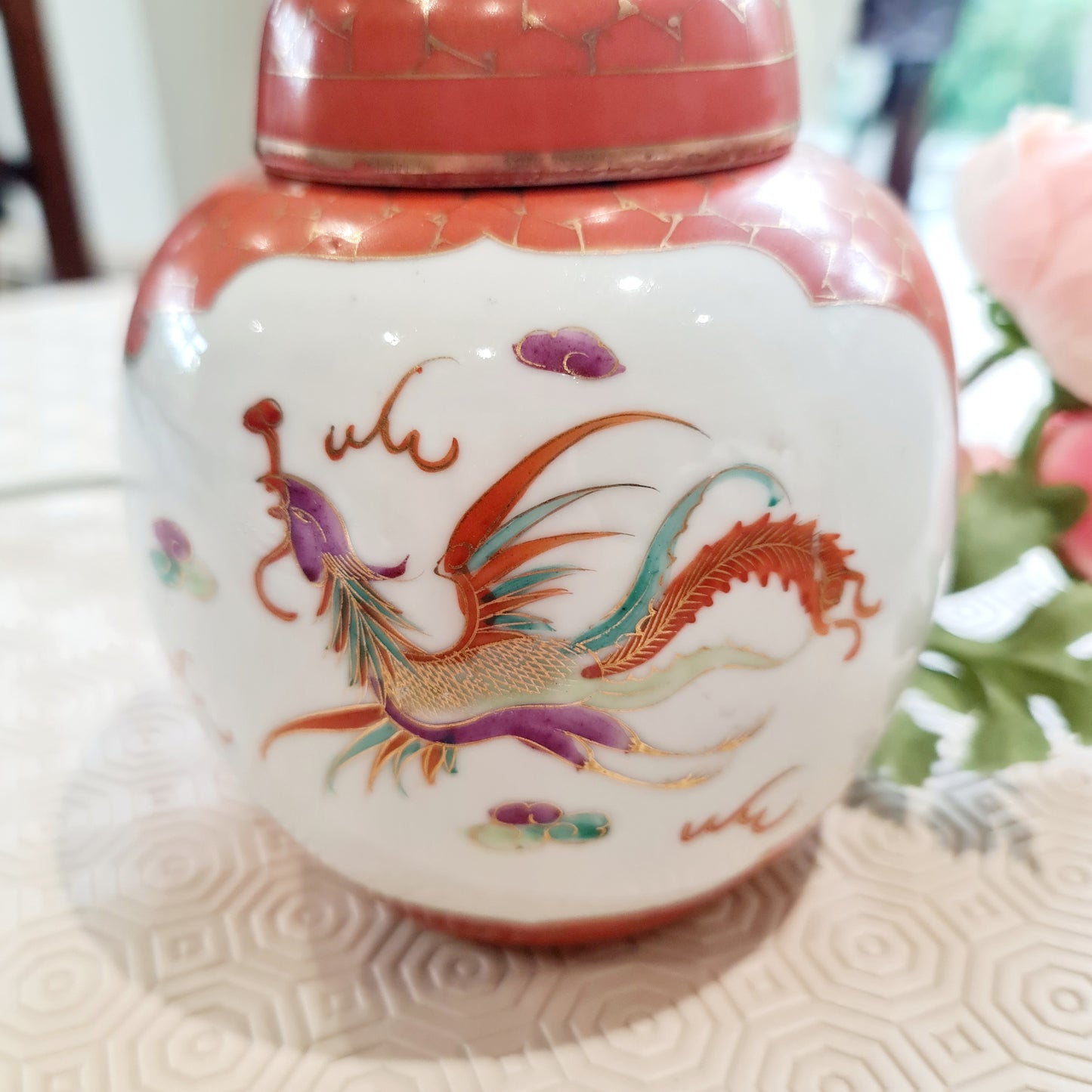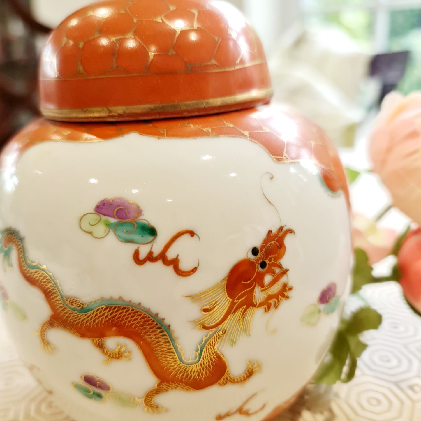The jar is all hand painted and features a dragon with flaming pearl and a rising Phoenix. All with a dragon scale design in red and gold.