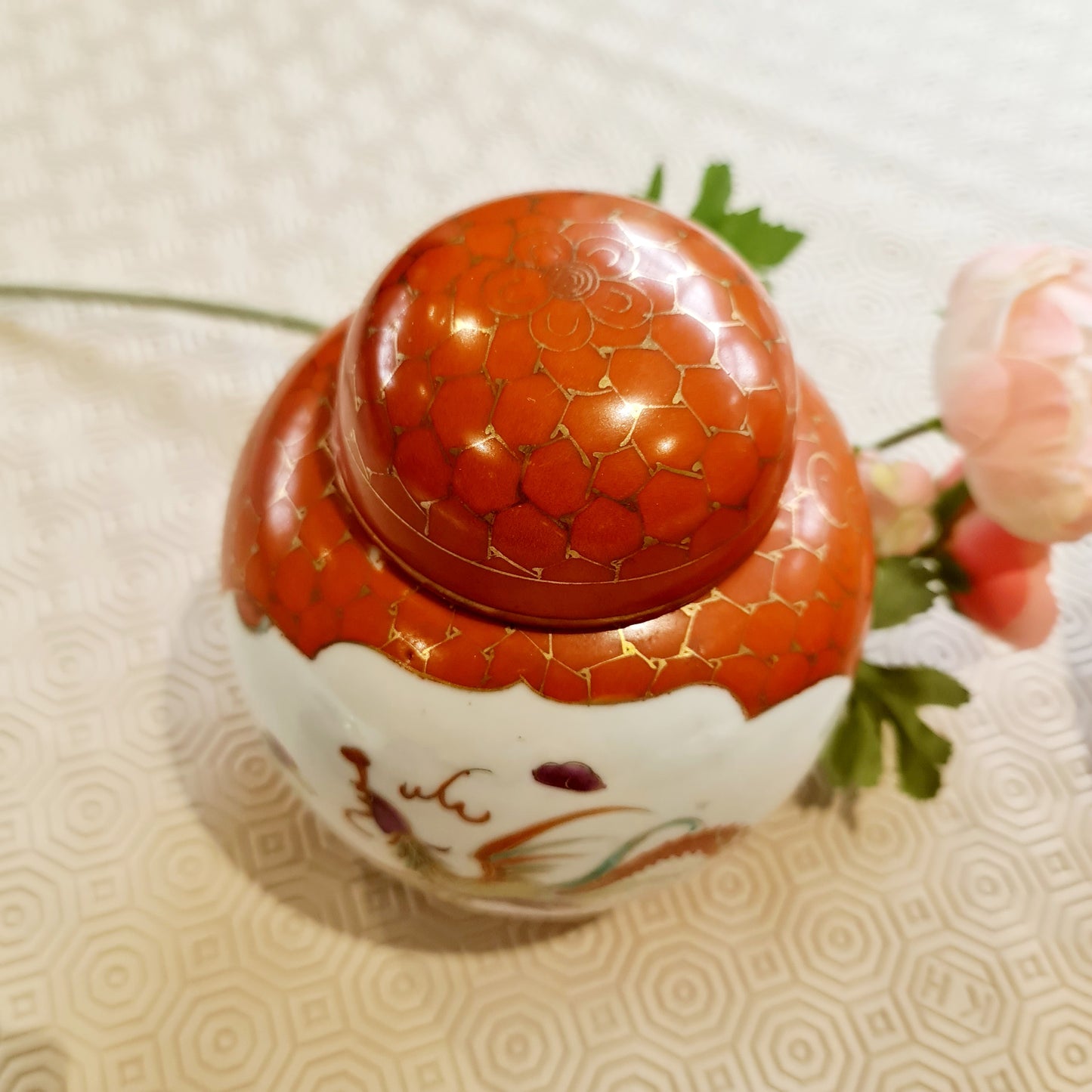The jar is in fantastic condition with no cracks or chips. Minor wear to gold and red enamel glaze is seen on the lid. This was acquired from an estate sale.