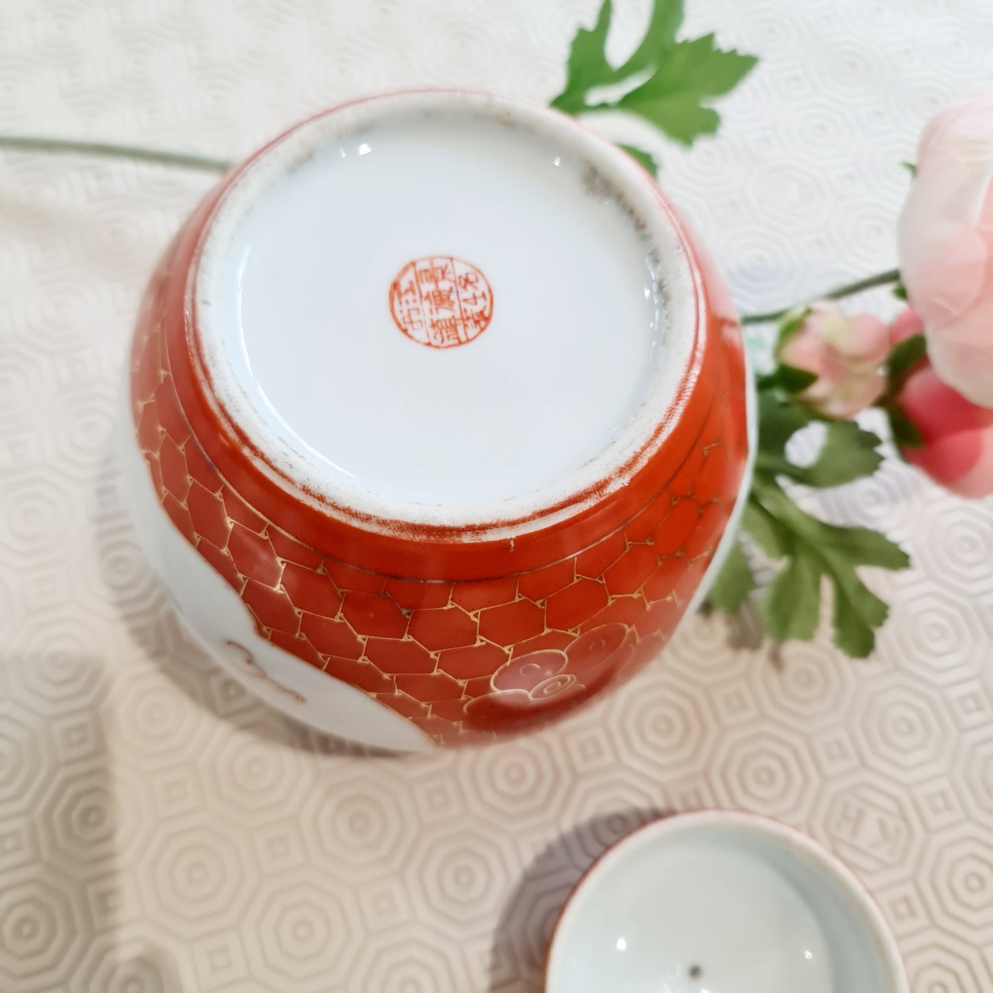 I would date the jar to the early Republic Era 1912-1920. This is based on paint color and the hand painted artwork, porcelain color and the foot of the piece. Later pieces are less fine on the painted design and also, the iron oxide paint was replaced with a synthetic paint that’s more saturated and less opaque in the 1960’s.
