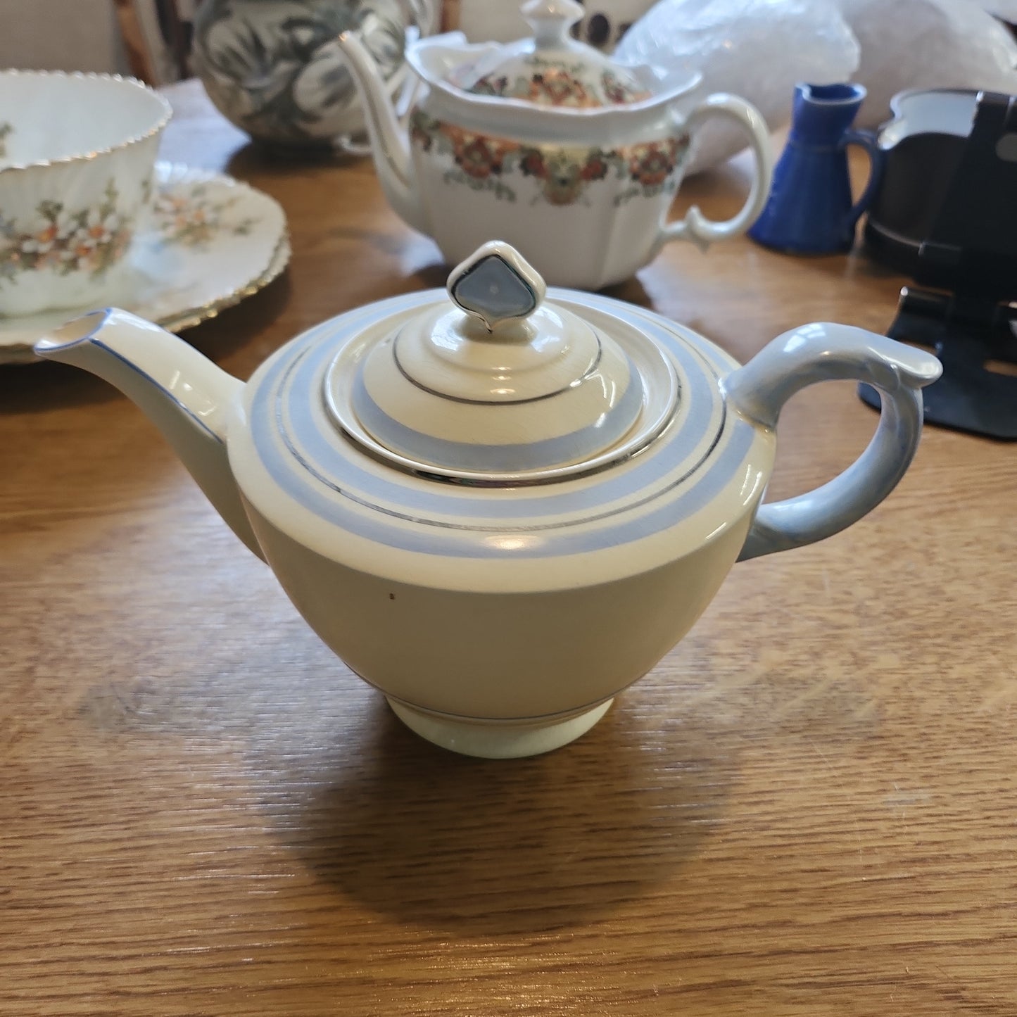 Art Deco porcelain tea set with blue decor. Teapot, creamer and sugar bowl. NEWHALL "NIRVANA" series 1008. 1930s.