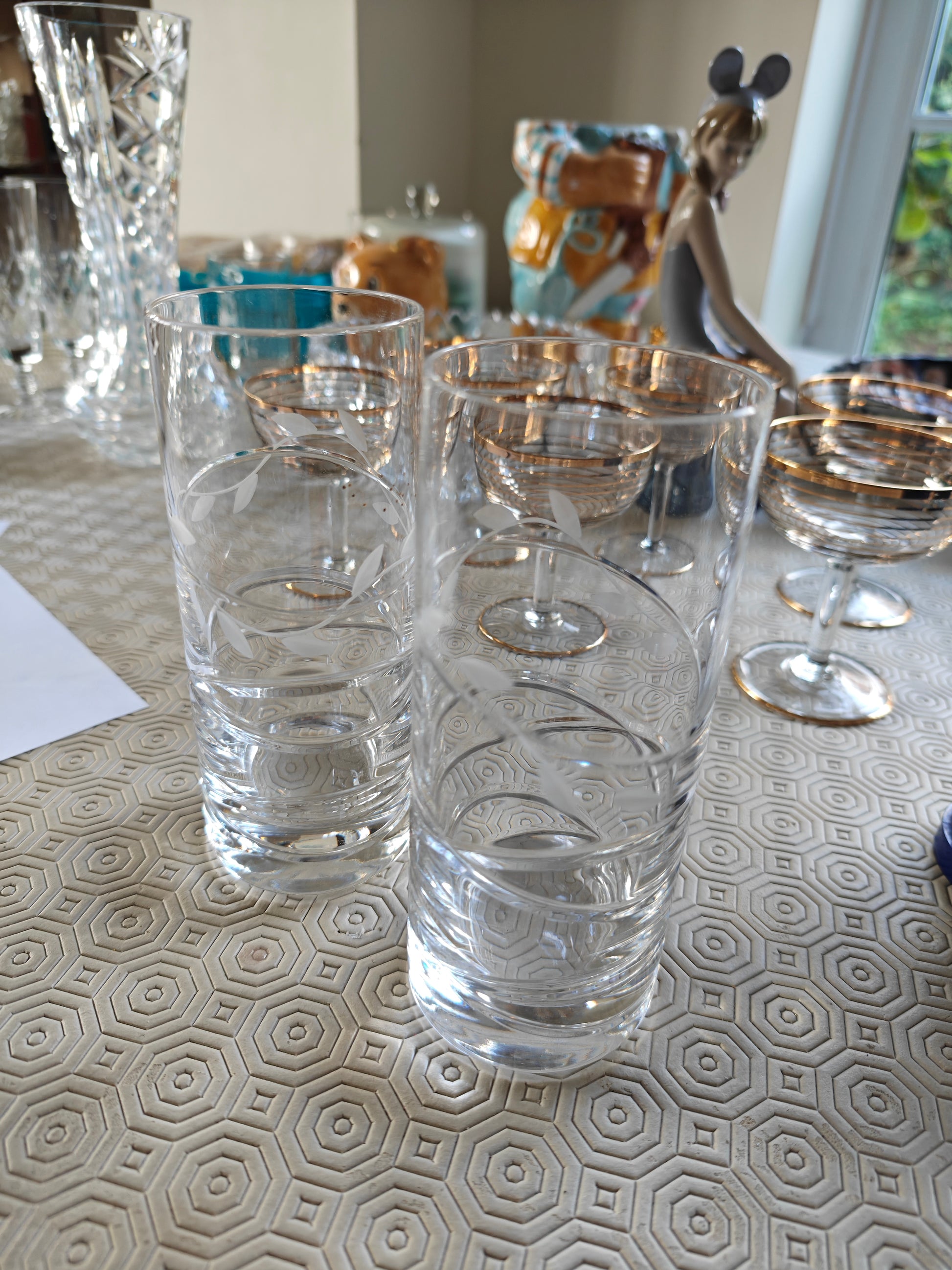 A pair of heavy bottom crystal glass with etching