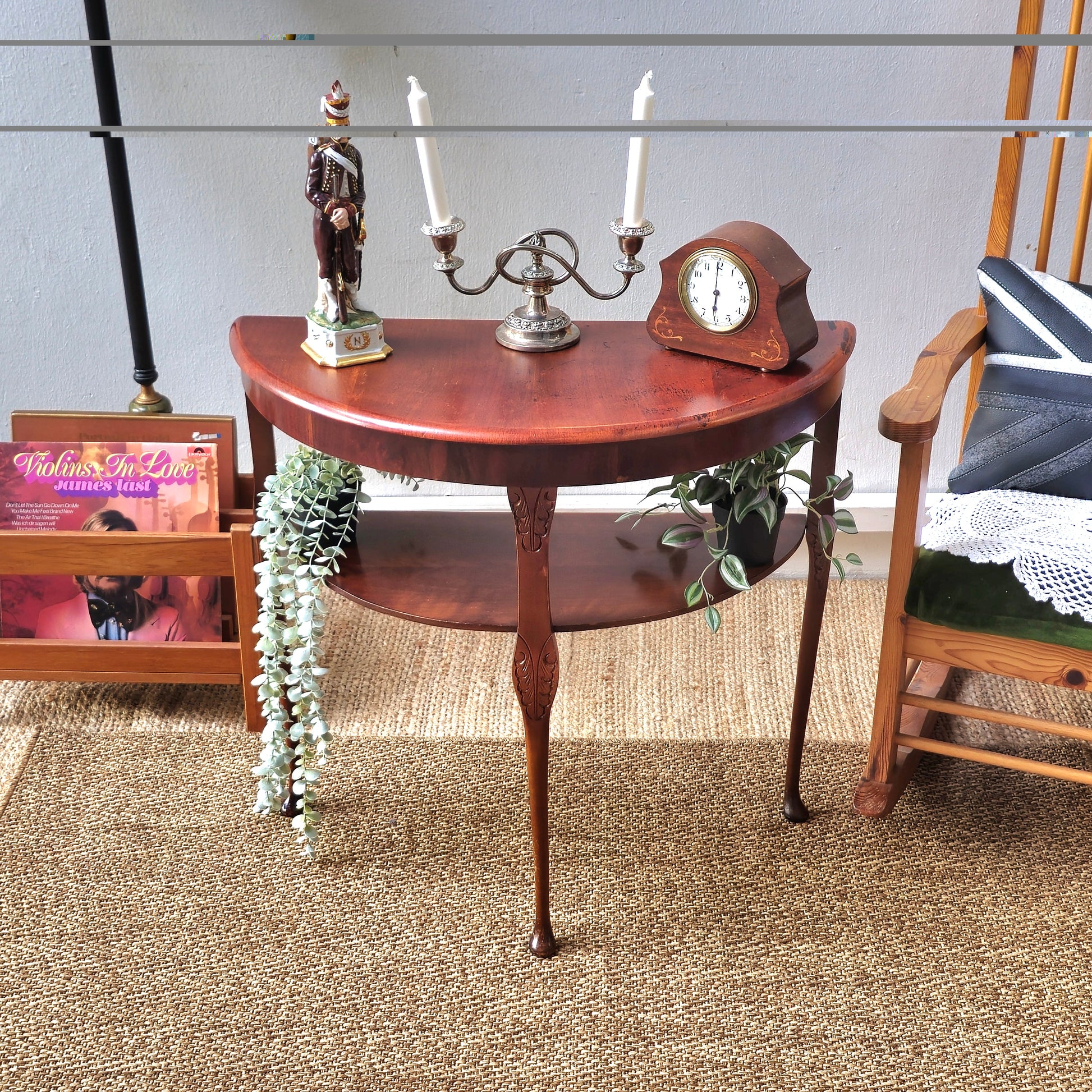 This elegant antique mahogany demilune (half-moon) console table features a graceful curved form, delicately carved cabriole legs, and a practical lower shelf for additional display or storage. Perfect for an entryway, hallway, or as an accent piece in any classic interior, its warm wood tone and timeless craftsmanship bring a refined vintage charm. The subtle carving detail and functional two-tier design make it both beautiful and versatile, ideal for showcasing décor, lamps, or floral arrangements.