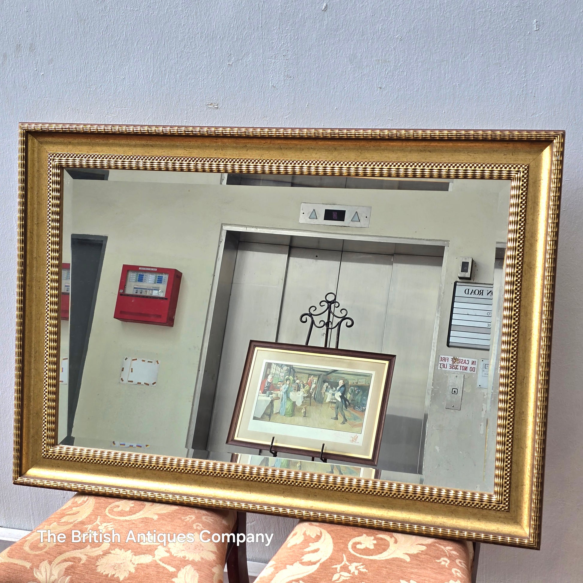 This vintage wall mirror features a gilt frame that adds a touch of classic elegance to any room. Measuring 43" by 33", it includes a bevel-edged glass that enhances its refined appearance while subtly reflecting light. Ideal for those seeking a sophisticated decorative piece with historical charm, this mirror combines timeless design with practical function.