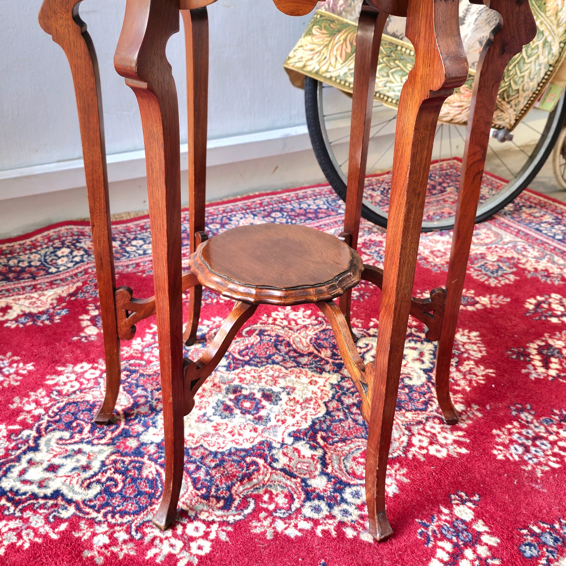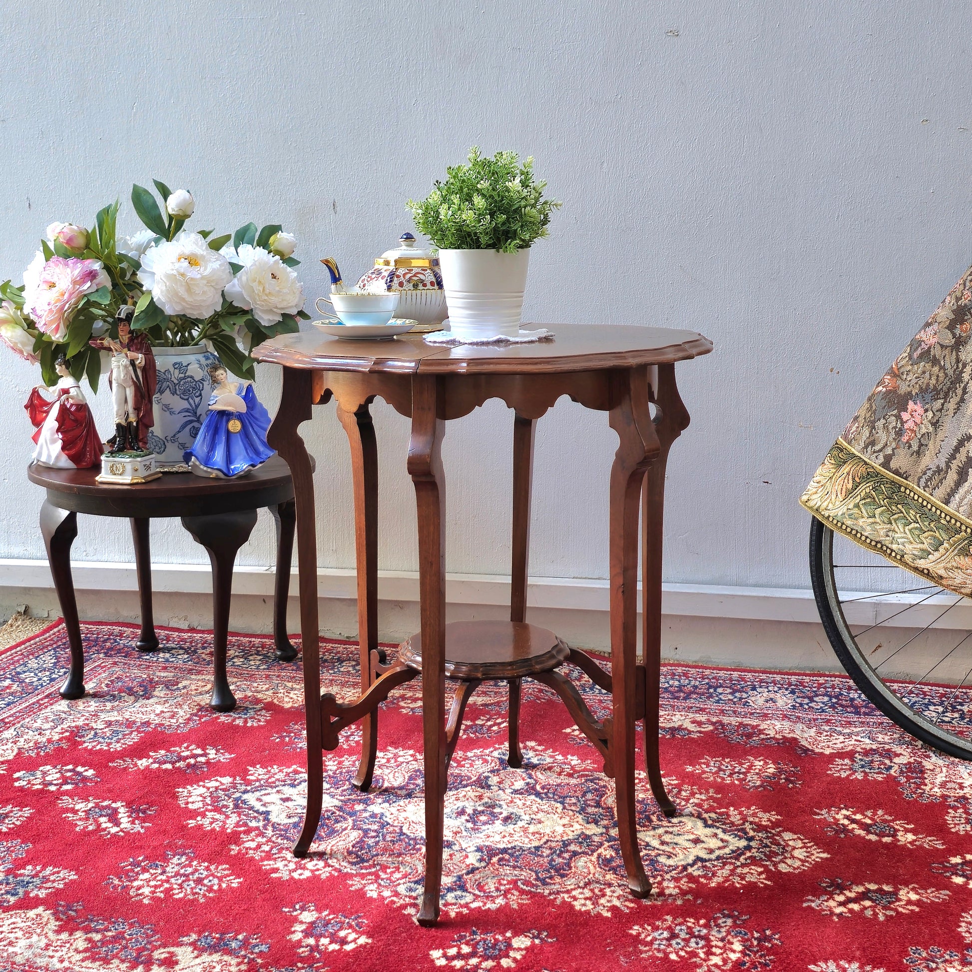 This elegant Edwardian two-tier centre table features a charming pie-crust edge and a 23-inch diameter, combining timeless design with practical functionality. Its classic craftsmanship adds sophistication to any living space. Its most defining features are the two tiers—a main tabletop and a smaller lower shelf—which add utility and grace.