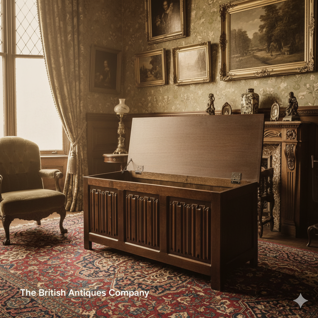A beautiful antique English oak blanket chest, crafted around the early 1900s. This sturdy piece showcases hand-carved Gothic-style panel detailing on the front, giving it a timeless and stately charm. Built from solid oak, it features a hinged lift-top lid revealing a spacious interior — perfect for storing linens, blankets, or keepsakes.