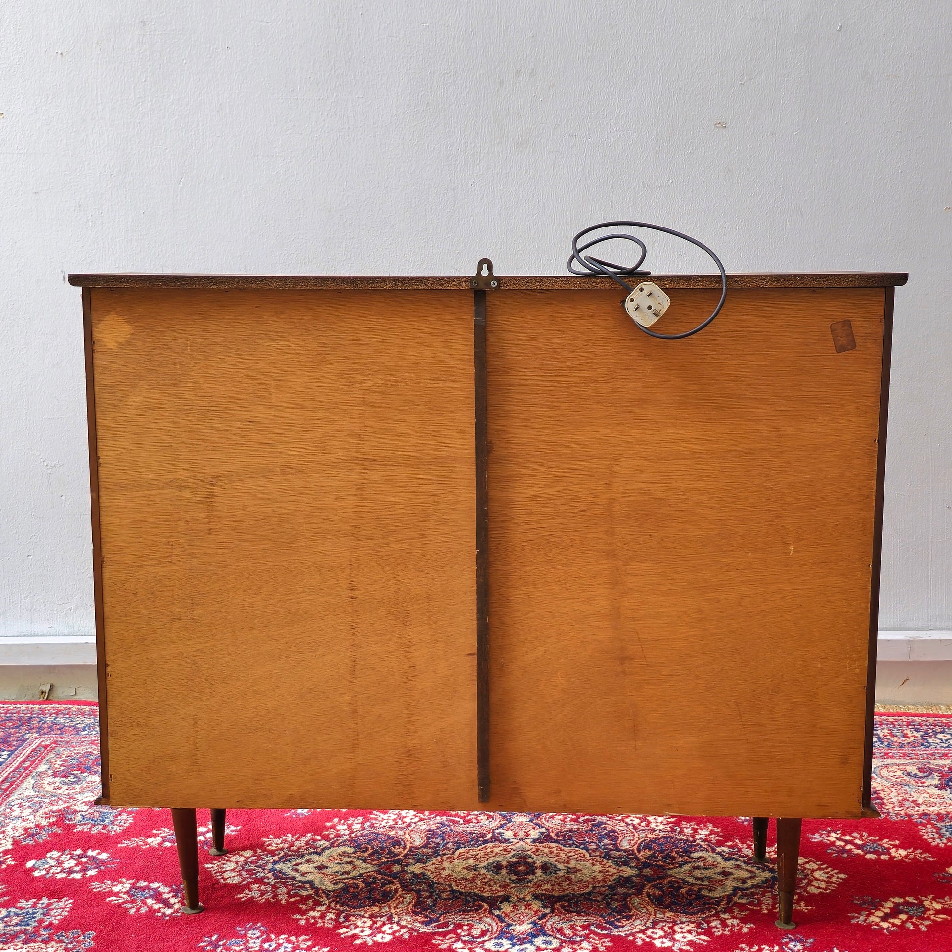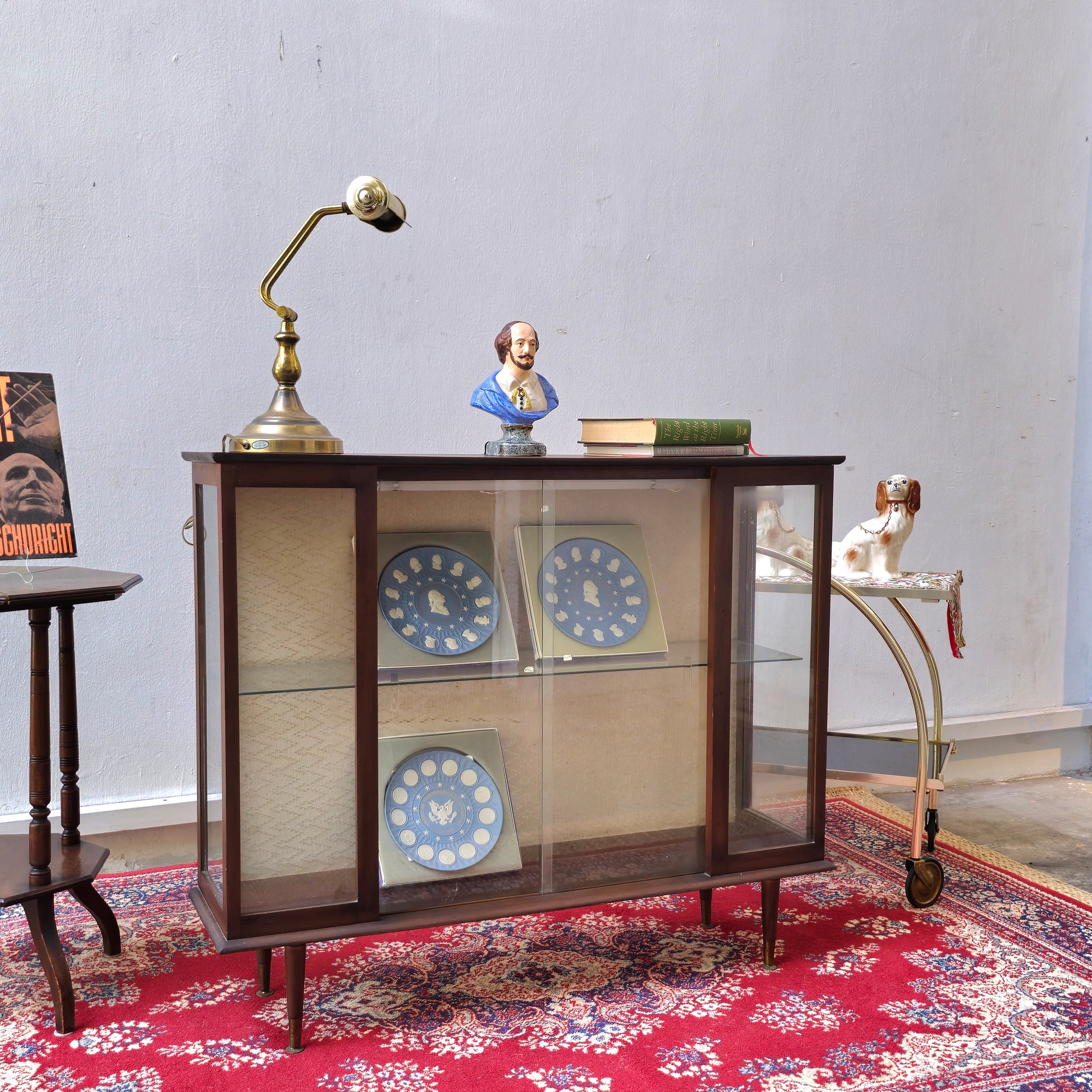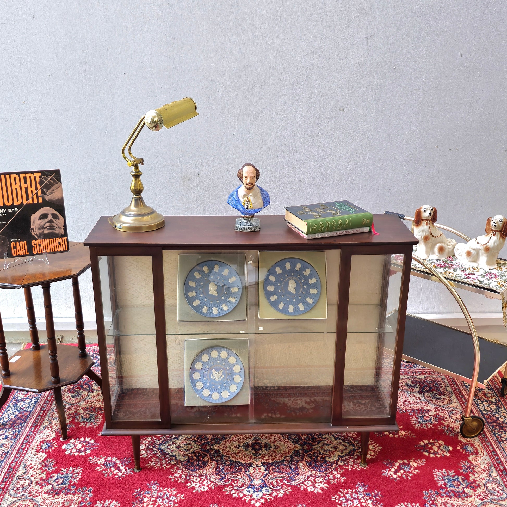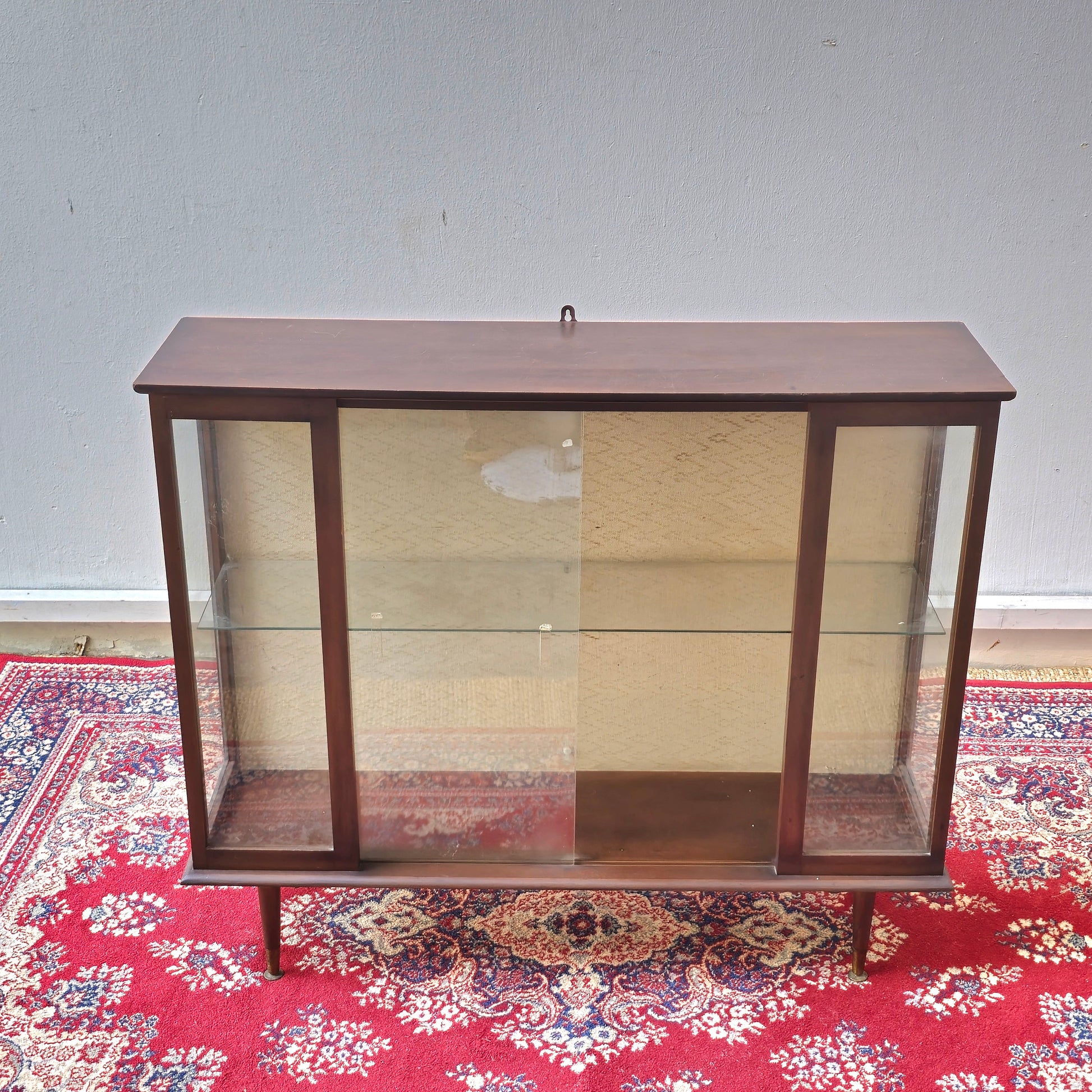 This Hubbinet 1960's glass display cabinet combines vintage charm with practical design. Measuring 107cm long, 34cm wide, and 89cm high, it offers an elegant way to showcase your treasured items while saving space. Its clear glass panels provide excellent visibility, making it perfect for displaying collectibles, fine china, or decorative pieces. Add a touch of mid-century style to your home with this timeless and functional cabinet.