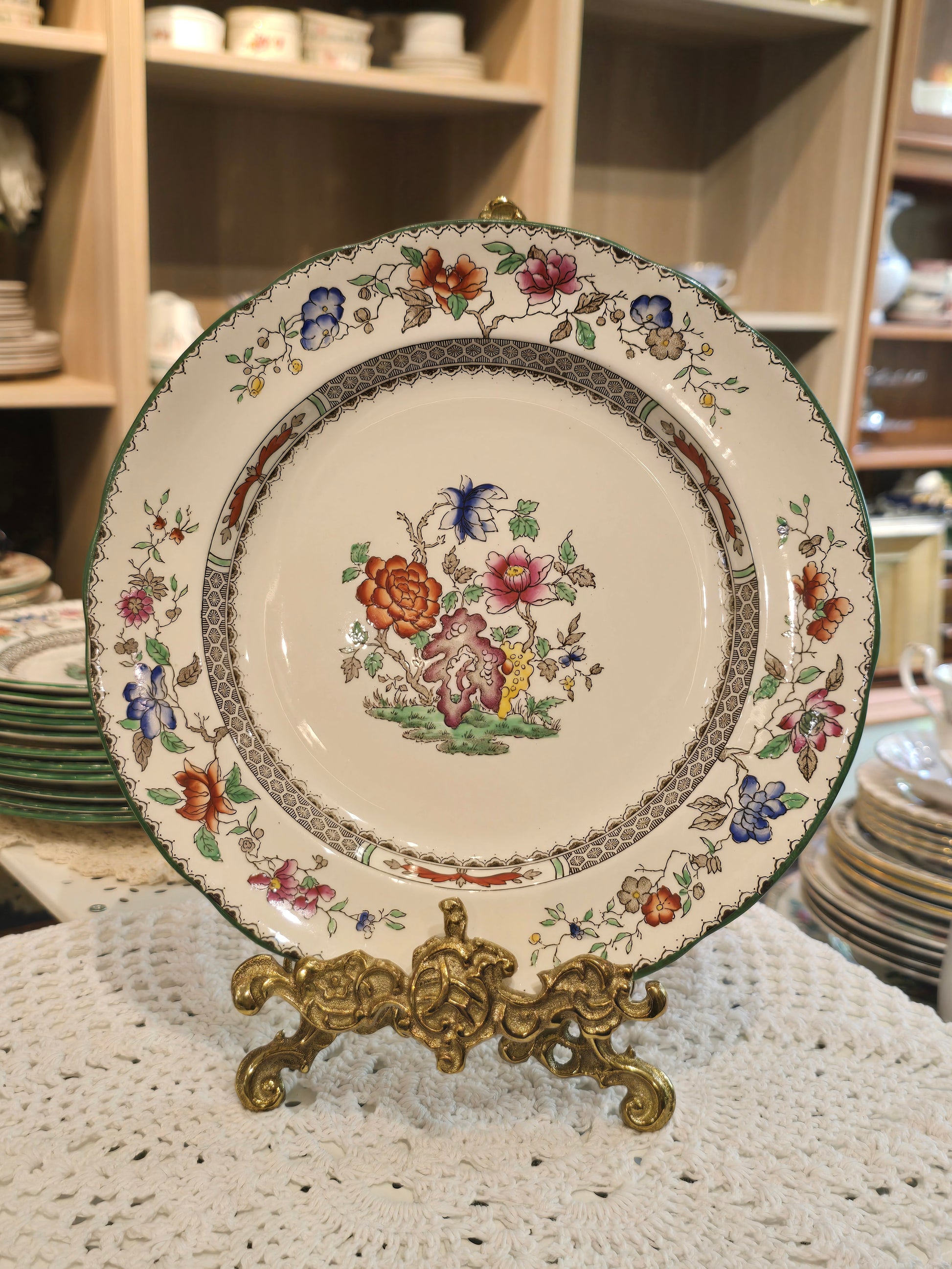 Enhance your dining experience with the Copeland Spode Chinese Rose Luncheon Plate. This timeless plate features the iconic Chinese Rose pattern, adorned with vibrant florals in rich reds, greens, blues, and pinks. Expertly crafted from fine English earthenware, it combines functionality with classic design, making it perfect for both everyday use and special occasions.
