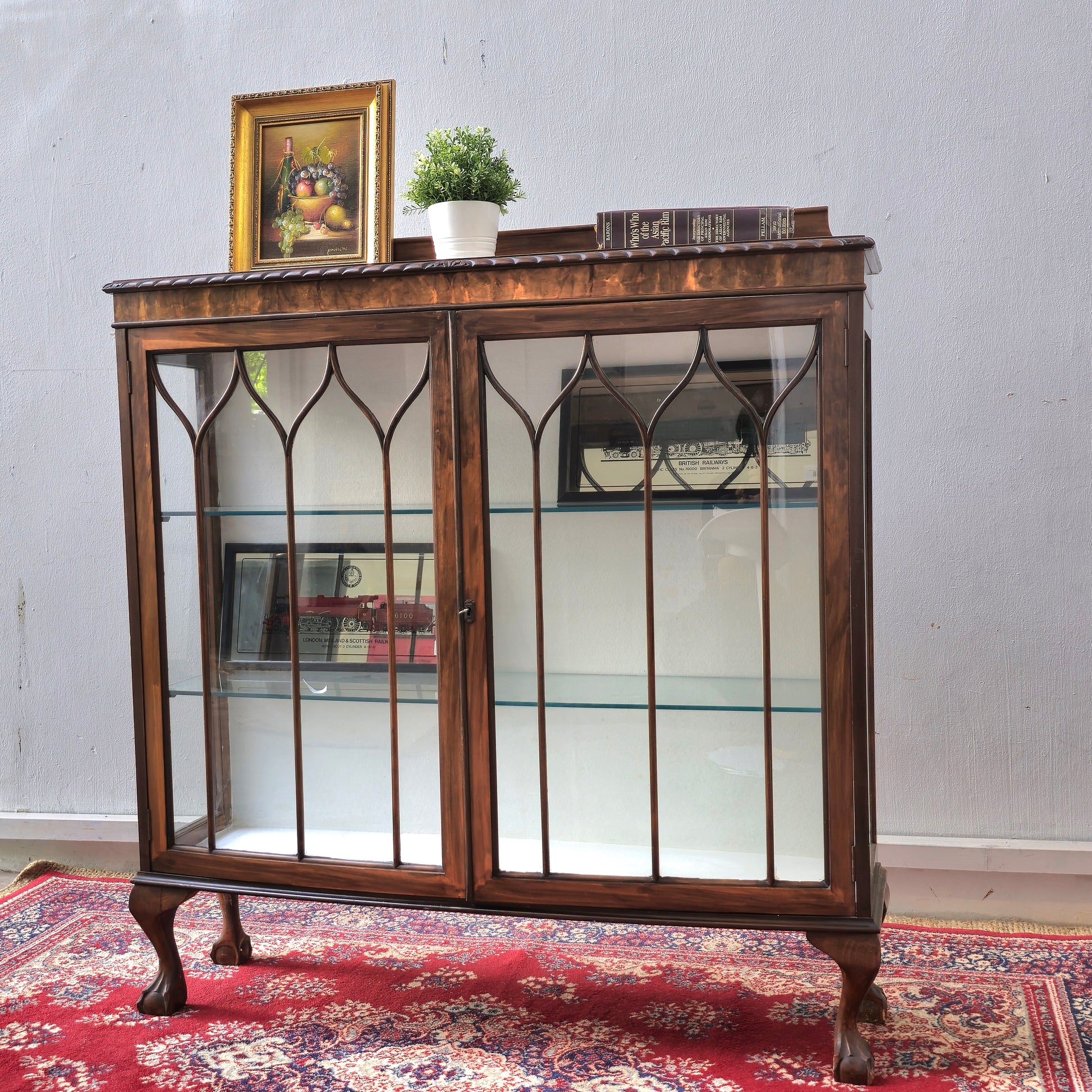 This early 20th-century walnut display cabinet combines timeless elegance with practical design. Featuring two doors, cabriole legs, and distinctive ball and claw feet, it offers a stylish way to showcase your treasured items. Measuring 48 inches wide, it fits beautifully in any room, adding a touch of classic charm and refined craftsmanship to your home.