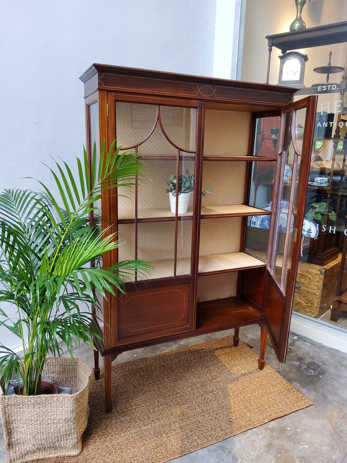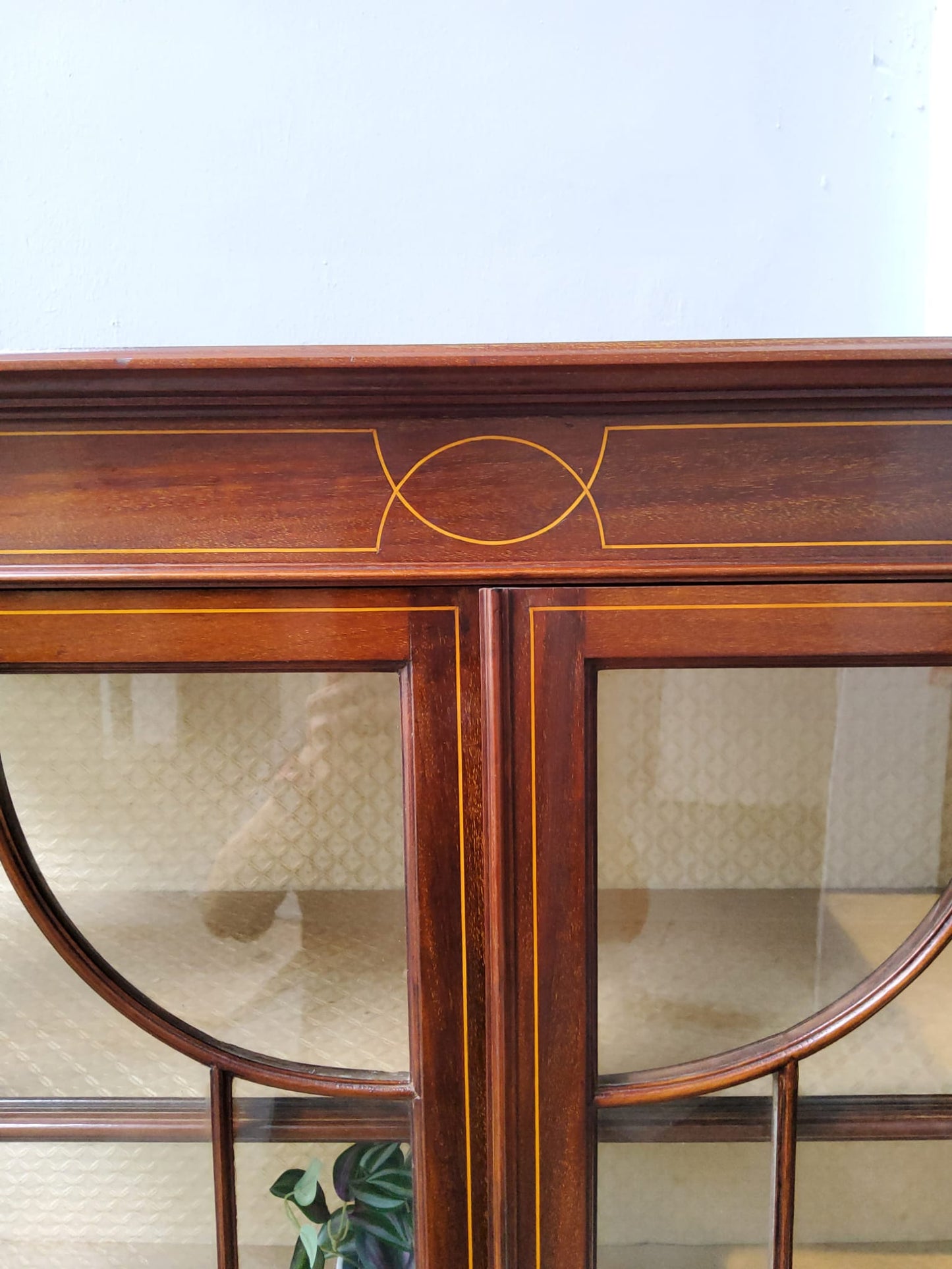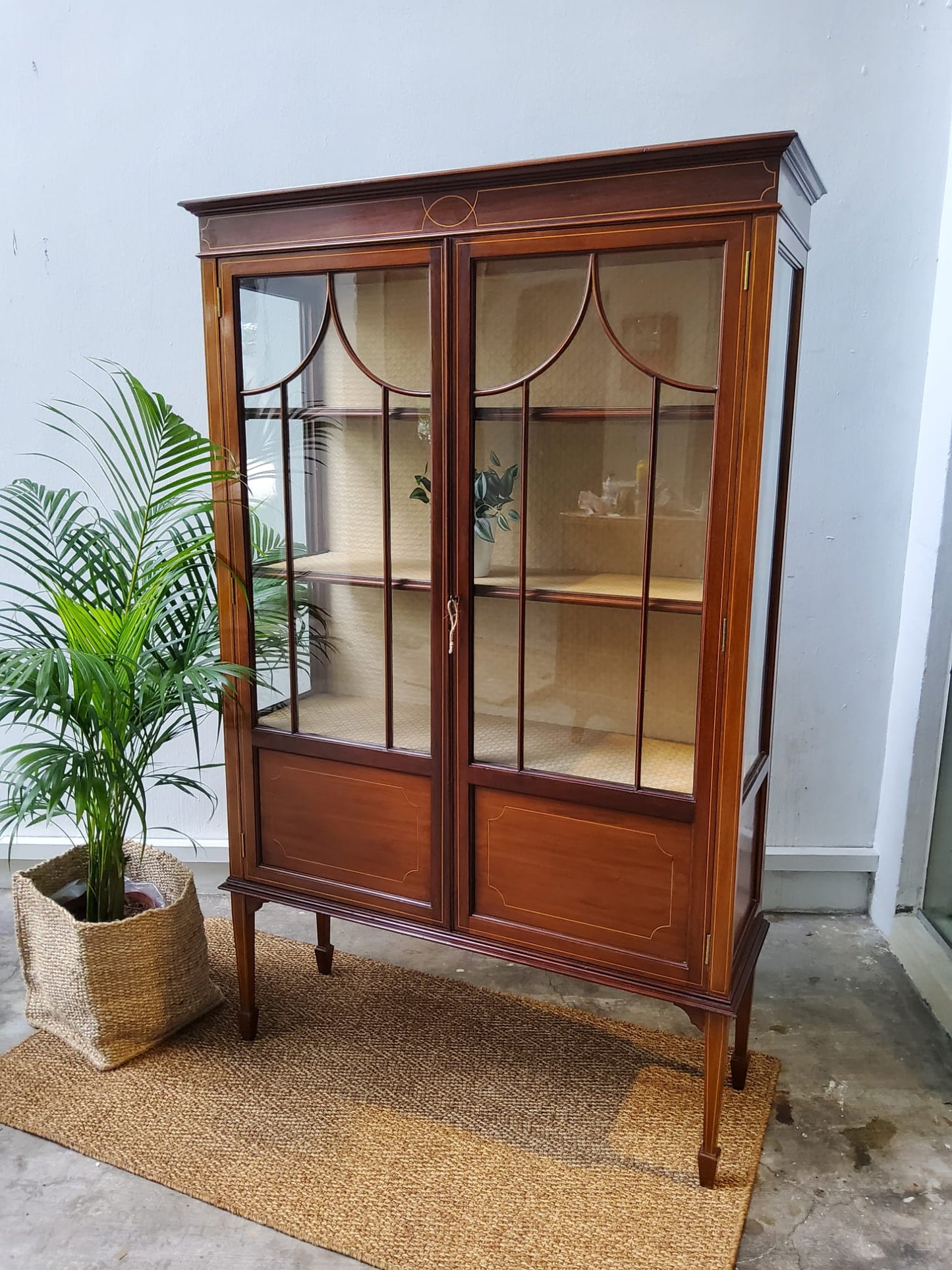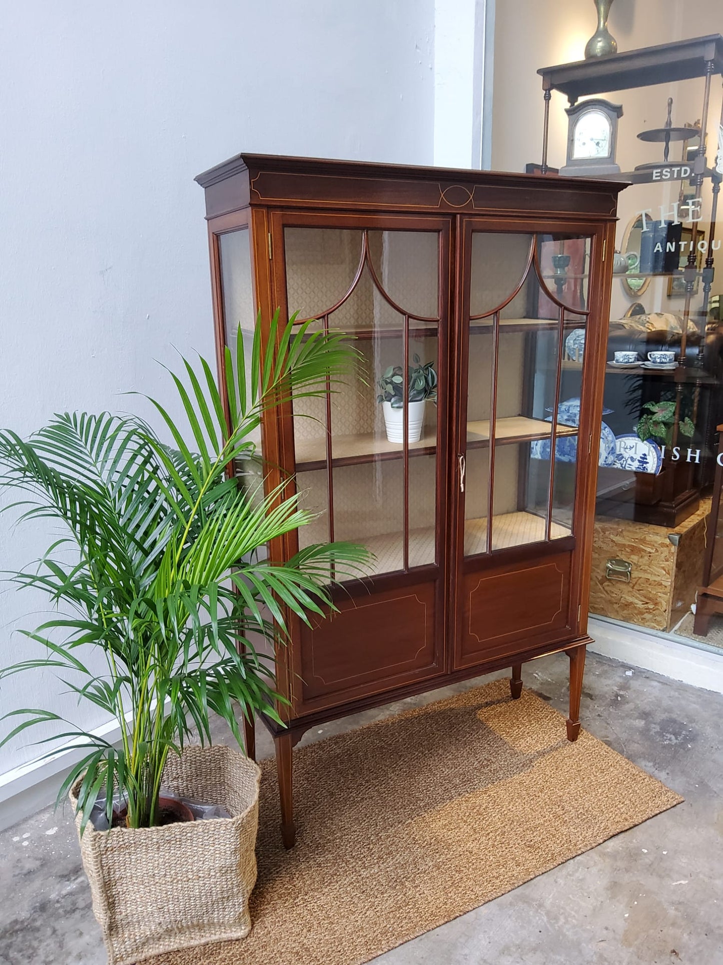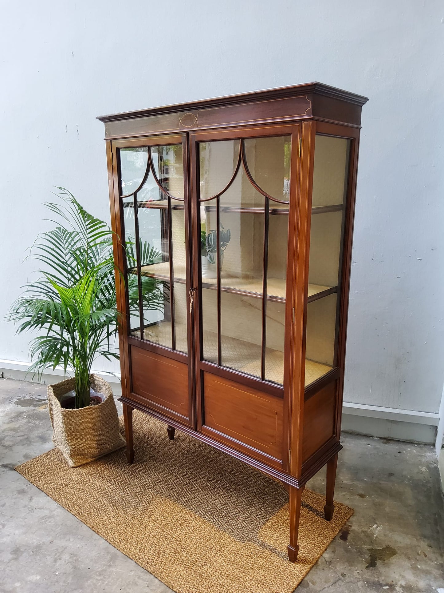Edwardian Mahogany Cabinet with Inlaid panel at cresting over 2 glassed doors revealing 2 shelves,over 2 panels concealing a lower shelf with 1 key.