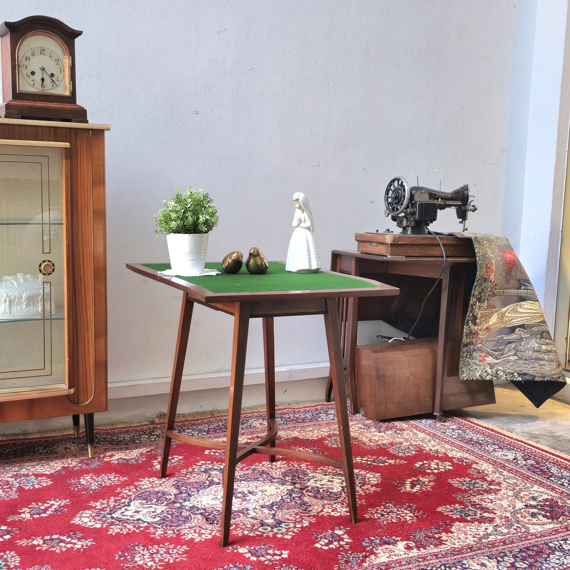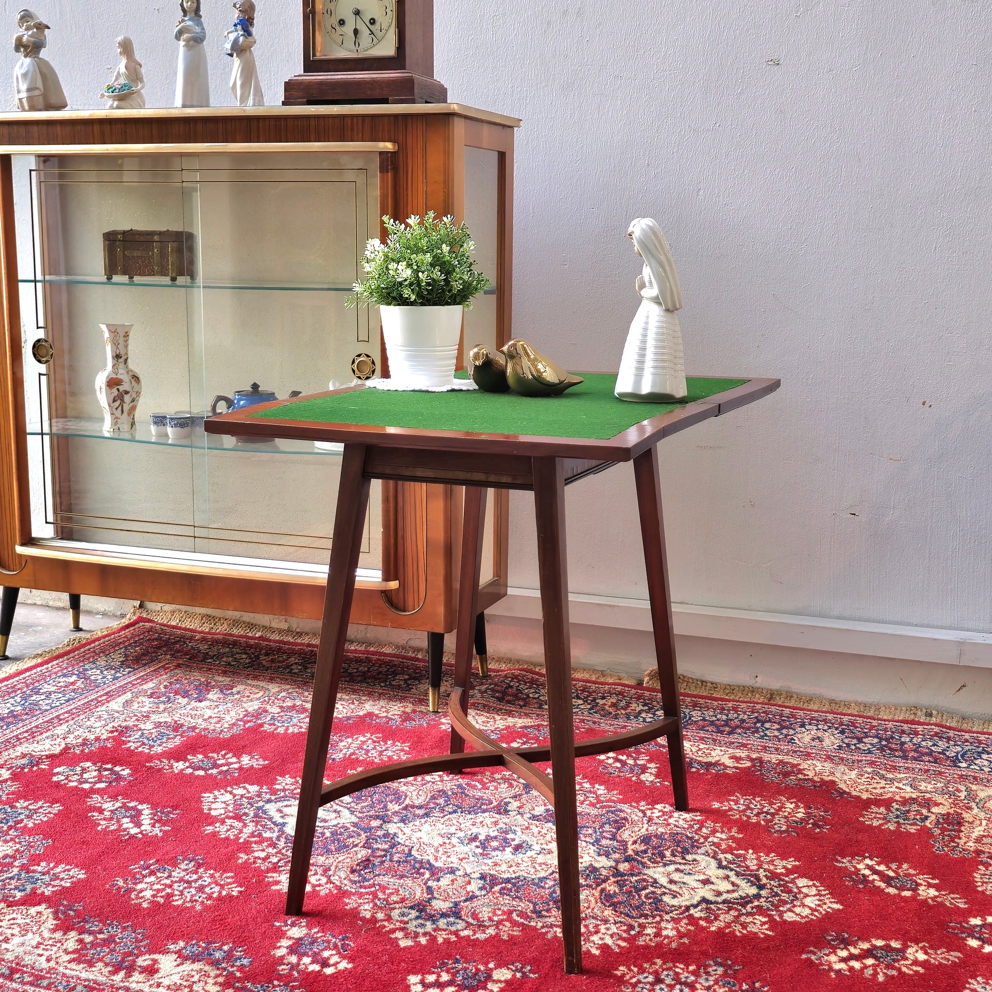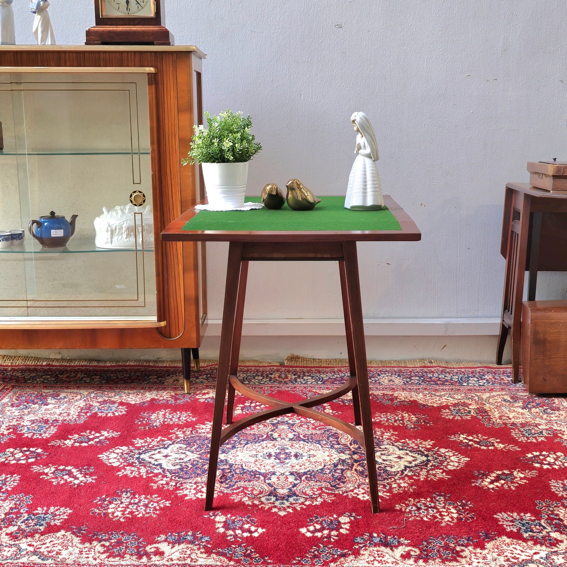 The Edwardian crossbanded mahogany rectangular fold-over card table is an elegant, multi-functional furniture piece popular during the Edwardian era (c. 1901-1910). It is constructed primarily of mahogany and features crossbanding, a decorative technique where veneers are laid across the grain, often in contrasting woods, along the edges. The fold-over top allows the compact rectangular console table to open and double in size to form a square playing surface, often lined with baize, making it a sophisticated and practical item for social gatherings and card games.