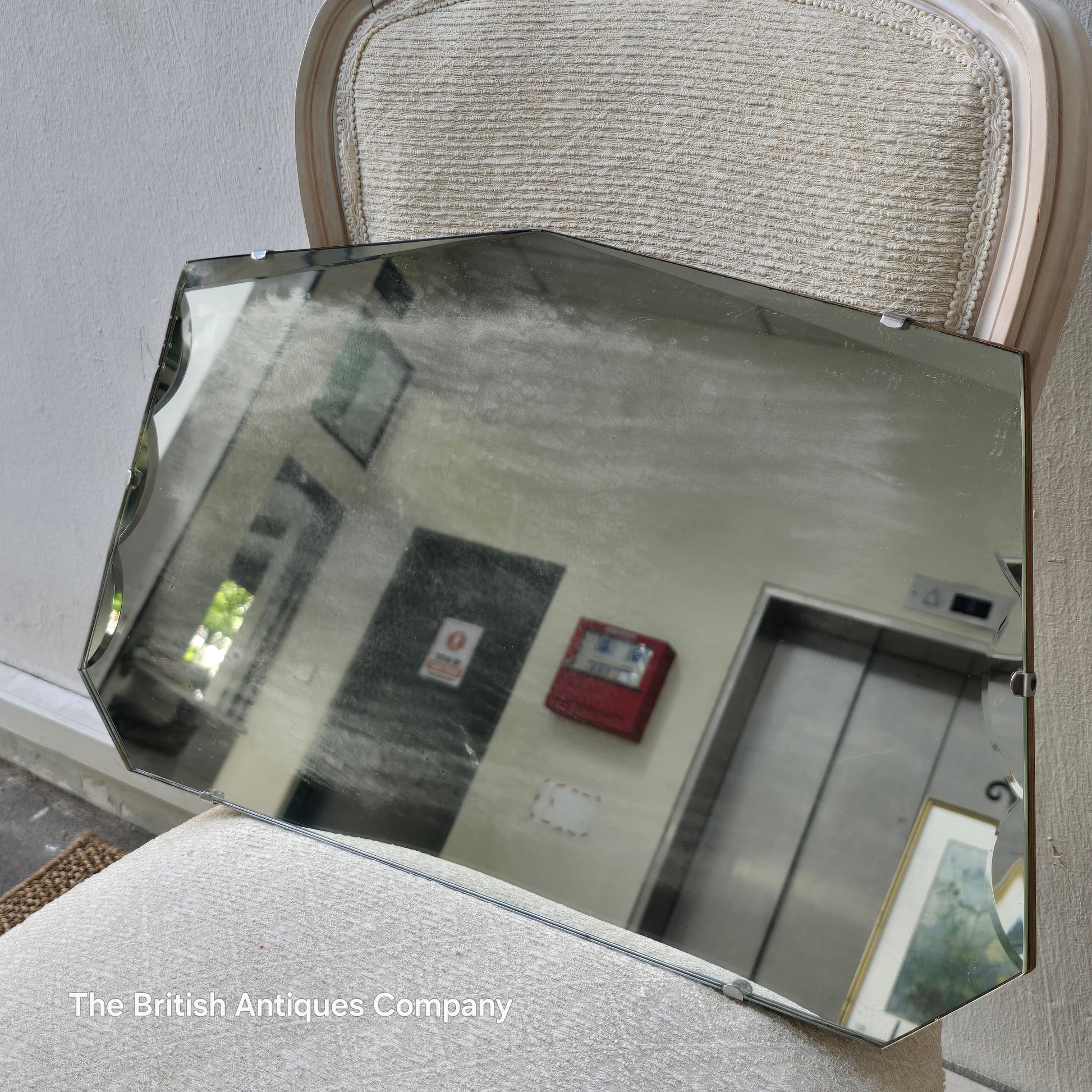 A key feature is the beautifully bevelled edges that run along all its contours. These bevels not only provide a decorative border but also skillfully catch and refract light, creating a subtle sparkle and enhancing the mirror's visual depth. On one of the longer sides (the left in the image), there are additional decorative cut-outs or etched flourishes, adding a unique artistic detail and further emphasizing its vintage charm.