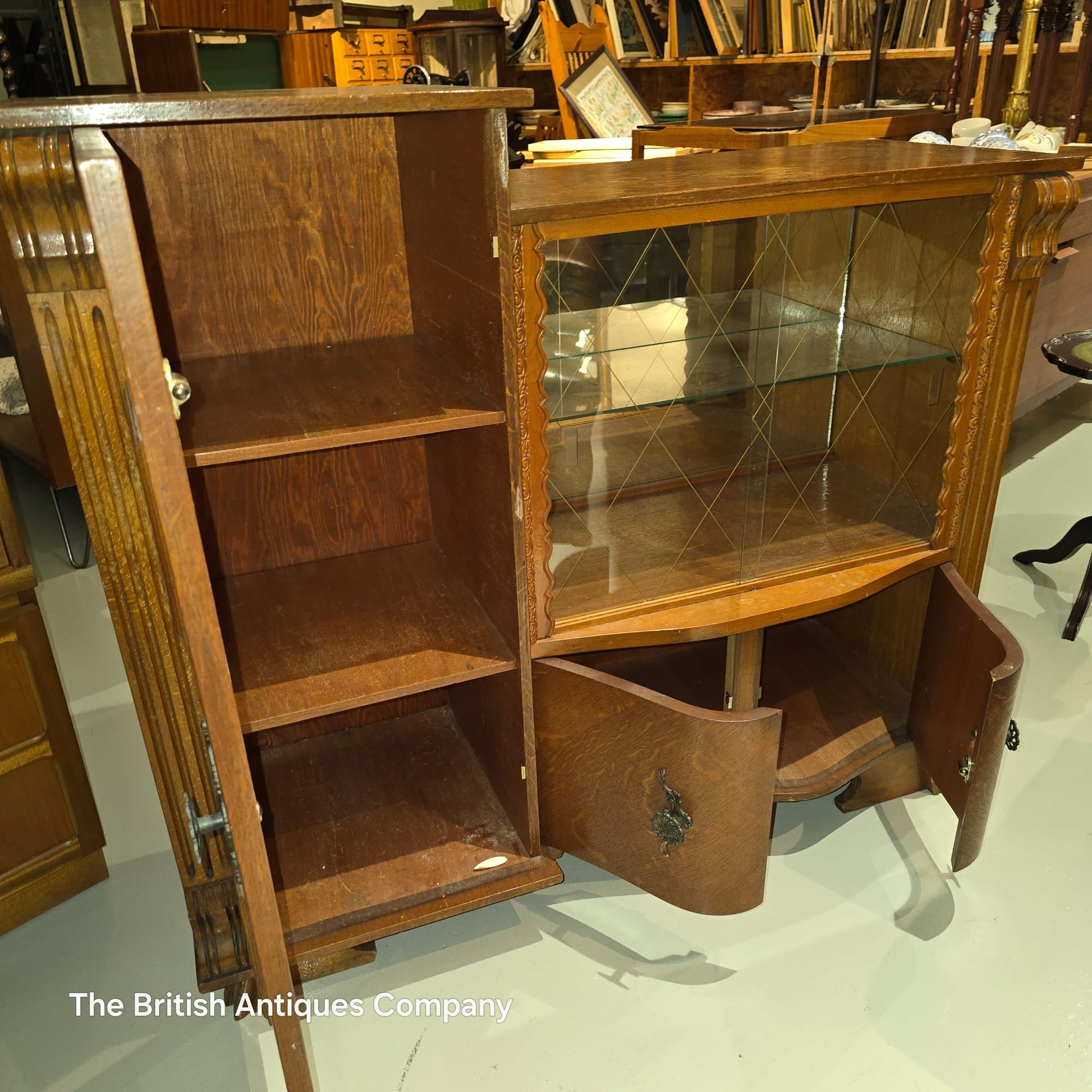 This magnificent French display cabinet, featuring a combination of enclosed storage and a central glass vitrine, is perfectly showcased in a lavish, Rococo-inspired interior. The cabinet's warm, medium-toned wood and geometric carved details in Art Deco transitional design. The piece serves as an elegant focal point, bridging historical grandeur with sophisticated early 19th-century craftsmanship.
