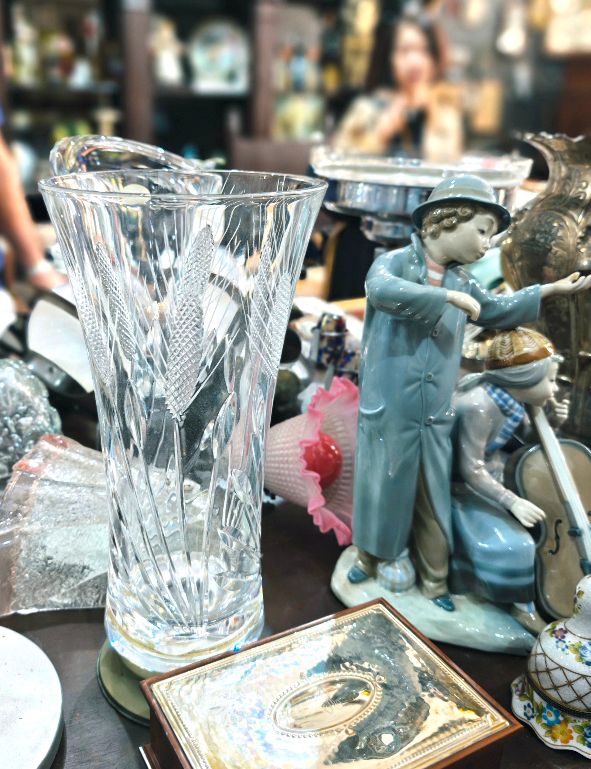 High-quality cut crystal vase with etched wheat stalks and brass base, exemplifying the refined botanical aesthetics of 1950s design. The delicate wheat stalk etchings—a signature motif of the era—are rendered with precision across the crystal's faceted surface, creating subtle light-play effects that shift throughout the day. The substantial brass base provides both structural stability and a warm metallic counterpoint to the crystalline clarity above. A distinguished accent piece for curated interiors, equally at home as a standalone display or paired with period furnishings. Ideal for collectors of mid-century decorative arts and those drawn to nature-inspired craftsmanship.