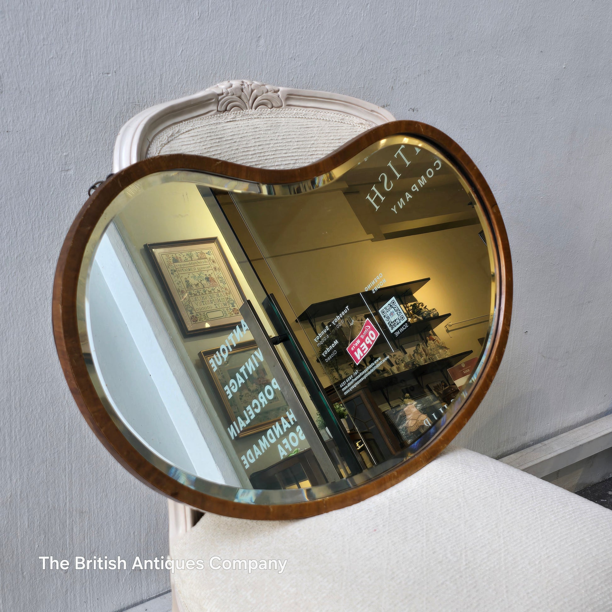 This delightful vintage mirror boasts a unique and whimsical kidney bean shape, offering a softer, more organic aesthetic than traditional rectangular or oval mirrors. It features a warm, rich wooden frame, likely crafted from oak or a similar hardwood, which beautifully complements its timeless design.