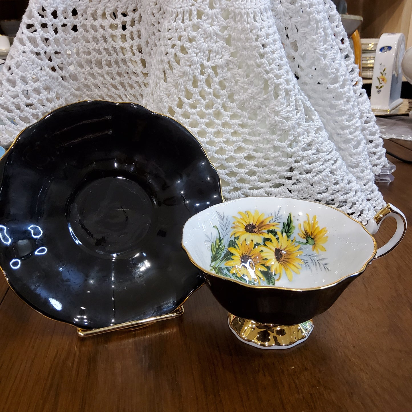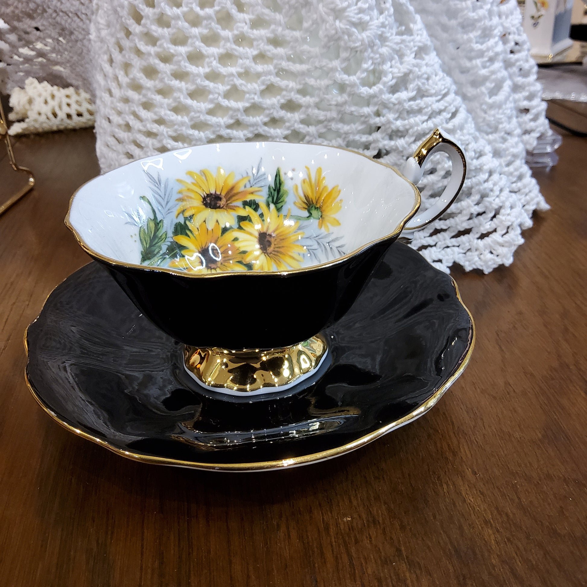 Bold and beautiful! This Queen Anne cup brings a dramatic back exterior with sunny yellow daisies inside! A perfect mix of elegance and cheer. English Bone China with gold details, truly a showpiece!