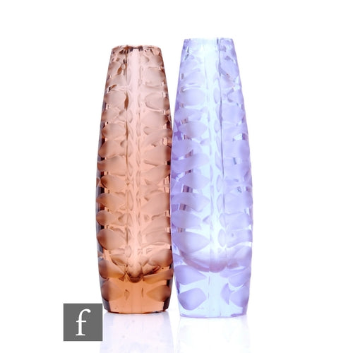 A Czech crystal glass vase designed by Vaclav Horacek for Zelezny Brod Sklo (ZBS), the swollen sleeve form body with vertical flutes and random abstract panels to the turquoise colour changing ground, height 20cm