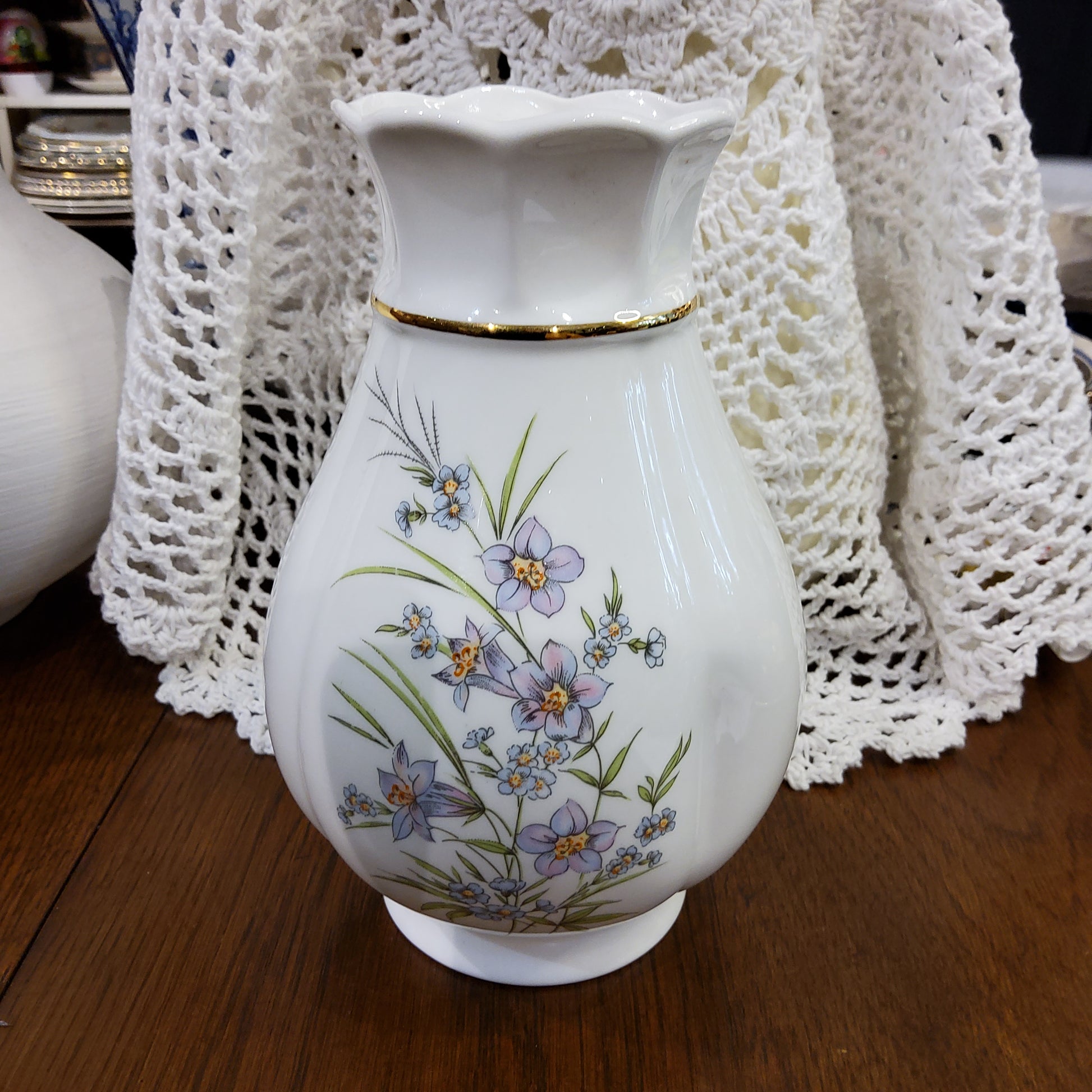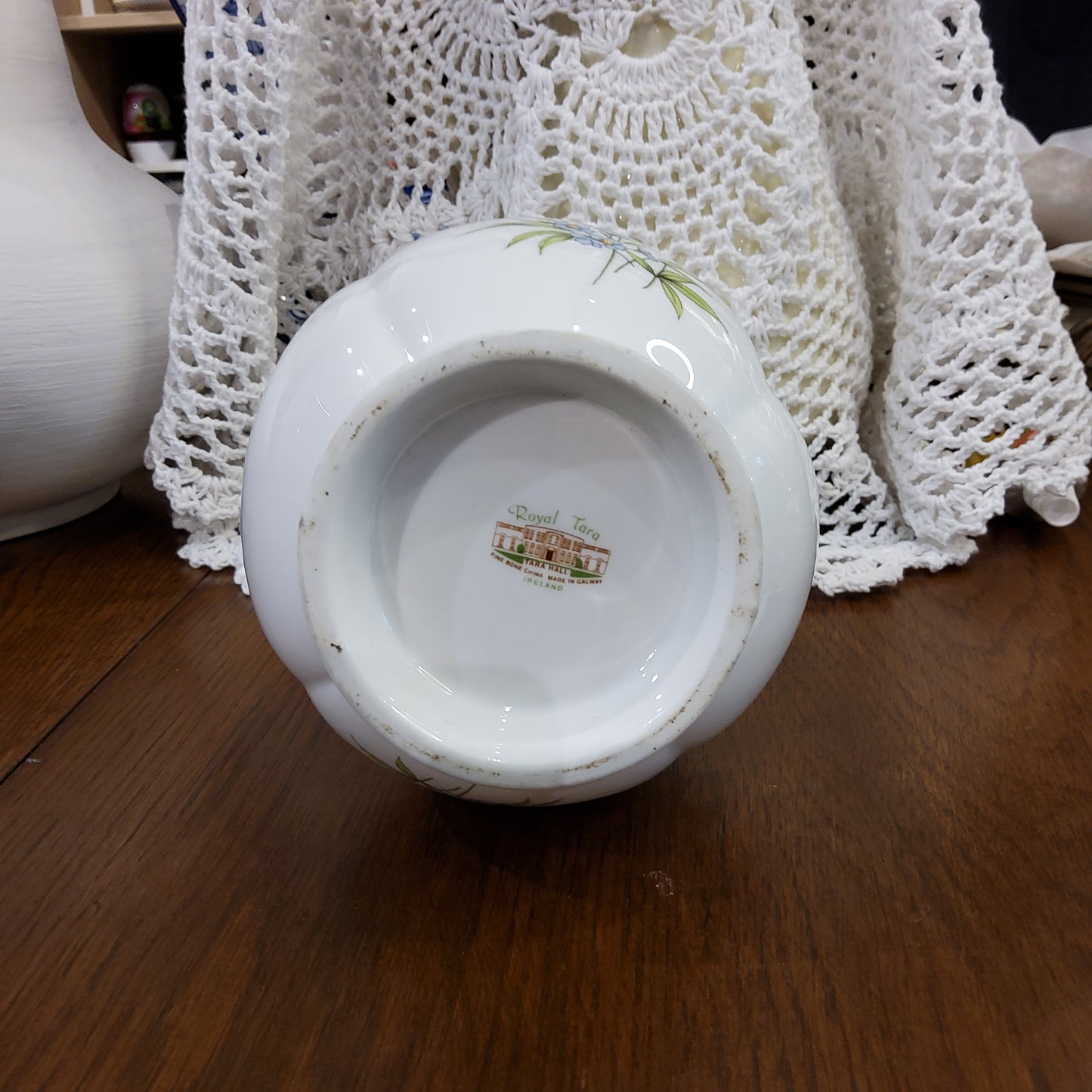 The design is soft white body with paste tells floral bouquet. Embellished with a real gold rim near the flared neck. Slightly panel body adds elegance and dimension. Royal Tara was known fornproducing high-quality Irish bone china from the 1950s to early 2000s. Each piece often reflected Ireland's natural charm and floral beauty.