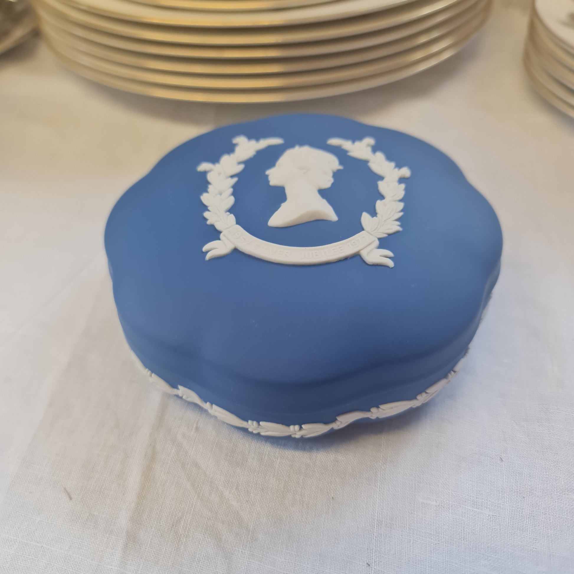 Wedgwood Royal Blue Jasperware Queen Elizabeth 2nd Silver Jubilee Scollop-edged Candy Box