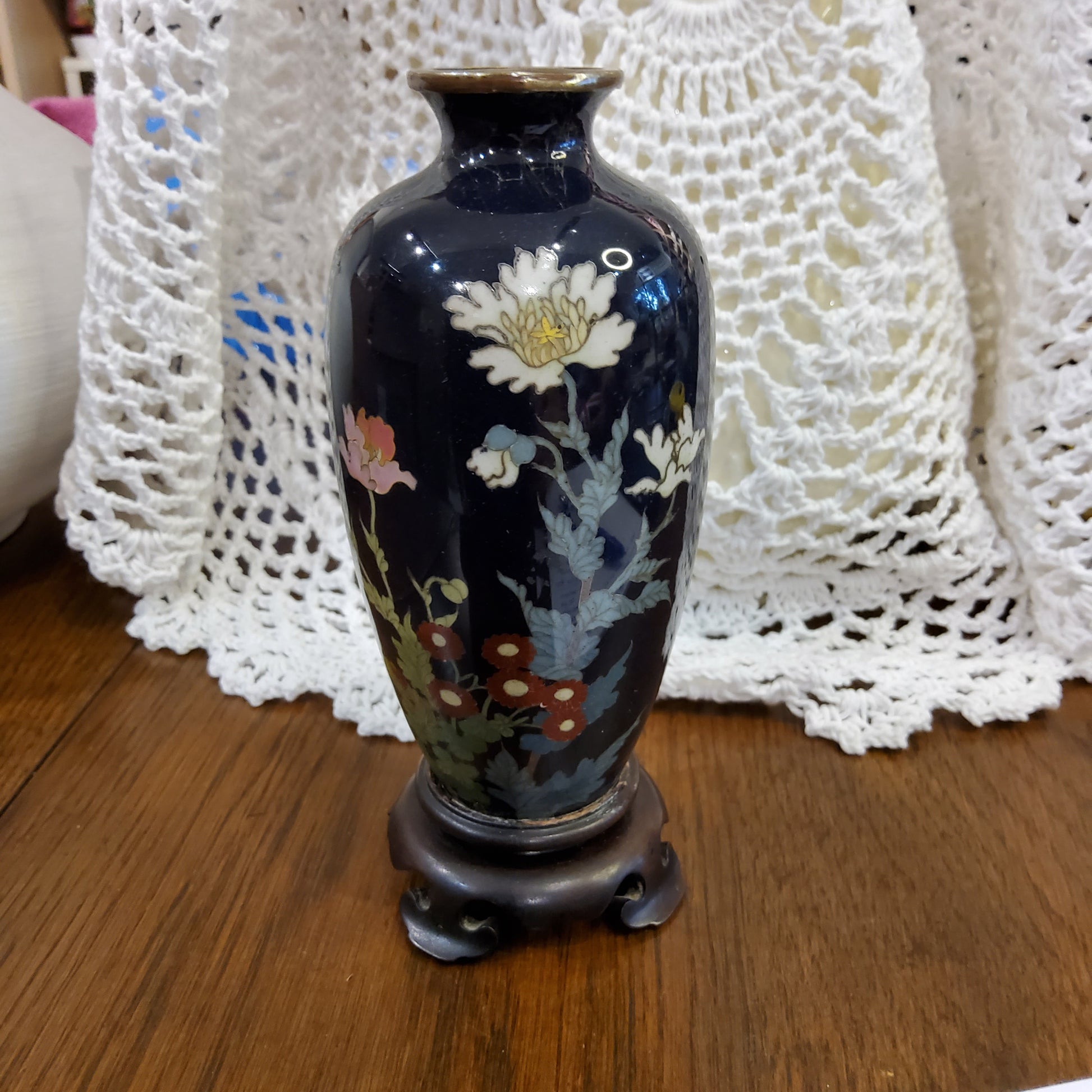 Material is Enamel over metal, cloisonne technique, the colour scheme is deep black base with vibrant enamel floral decoration. The shape is Baluster form with narrow neck and flared rim, the base mounted on an elegant carved wooden stand. Cloisonne is an ancient enamel technique using thin metal wires to separate colours, creating a mosaic effect. Highly prized in Asian decorative arts. This piece maybe be small, but it's crafted with centuries-old techniques and rich colour a lovely touch of East Asian artistry for your home.