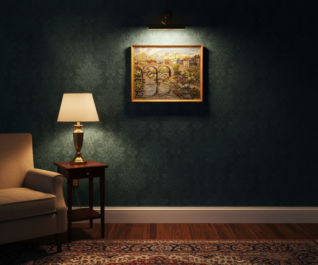 This is a beautifully detailed vintage needlepoint artwork depicting a picturesque town scene. The intricate stitching captures a charming riverside community, complete with a multi-arched bridge, historic buildings, and lush greenery. The vibrant colors and meticulous craftsmanship bring the scene to life, showcasing the artistry and skill involved in this traditional craft. Framed in a simple wooden border, this needlepoint piece adds a touch of vintage warmth and scenic beauty to any space.