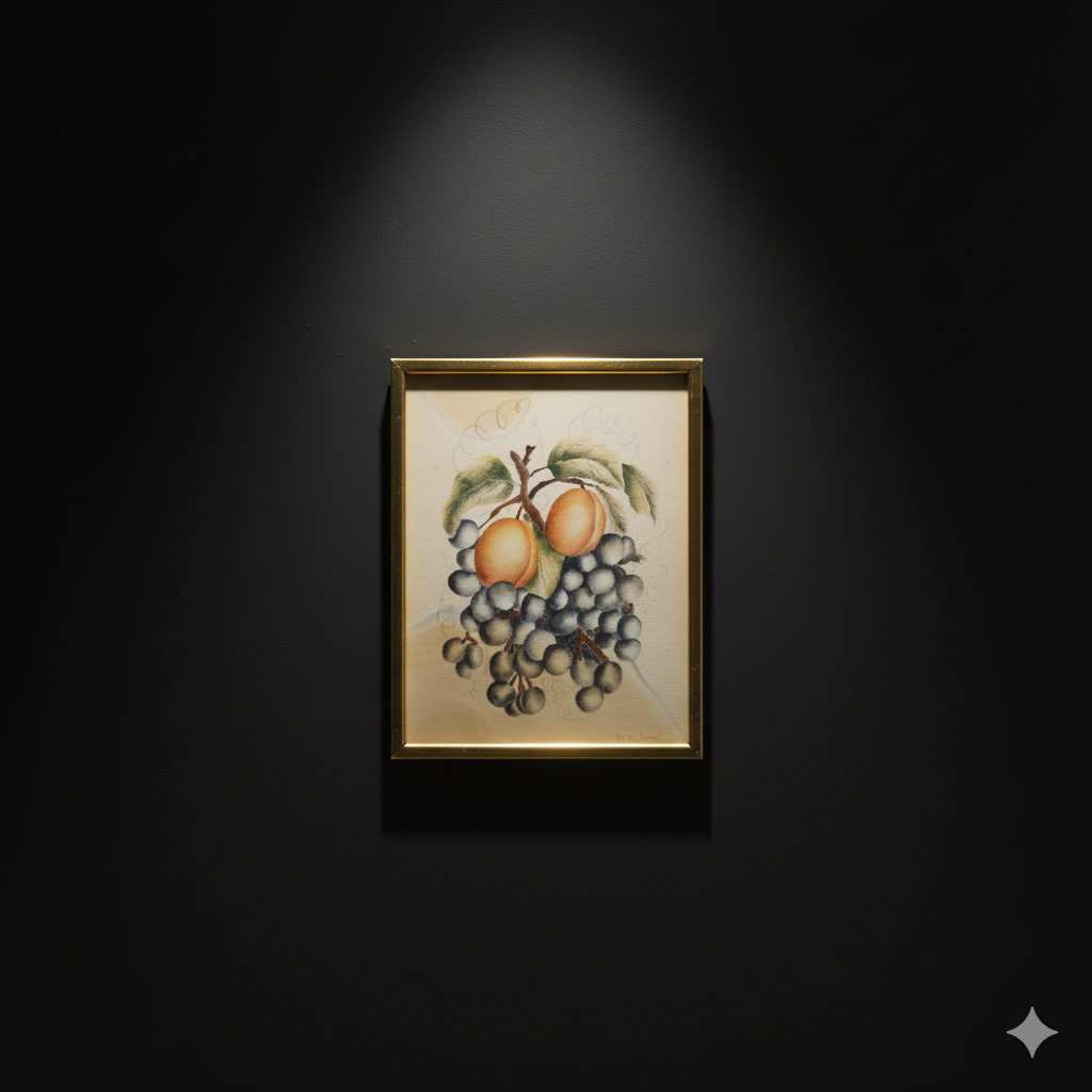 The watercolour technique gives the fruit a soft, almost luminous quality. The background is kept simple, allowing the focus to remain entirely on the fruit. Delicate vine tendrils are sketched loosely around the composition, adding a touch of naturalism. Signed "M.B. Curtis" in the bottom right corner, this vintage watercolour captures a classic still life subject with a gentle and appealing aesthetic. Framed in a thin gold-toned frame, this painting would bring a touch of traditional elegance and warmth to any space.