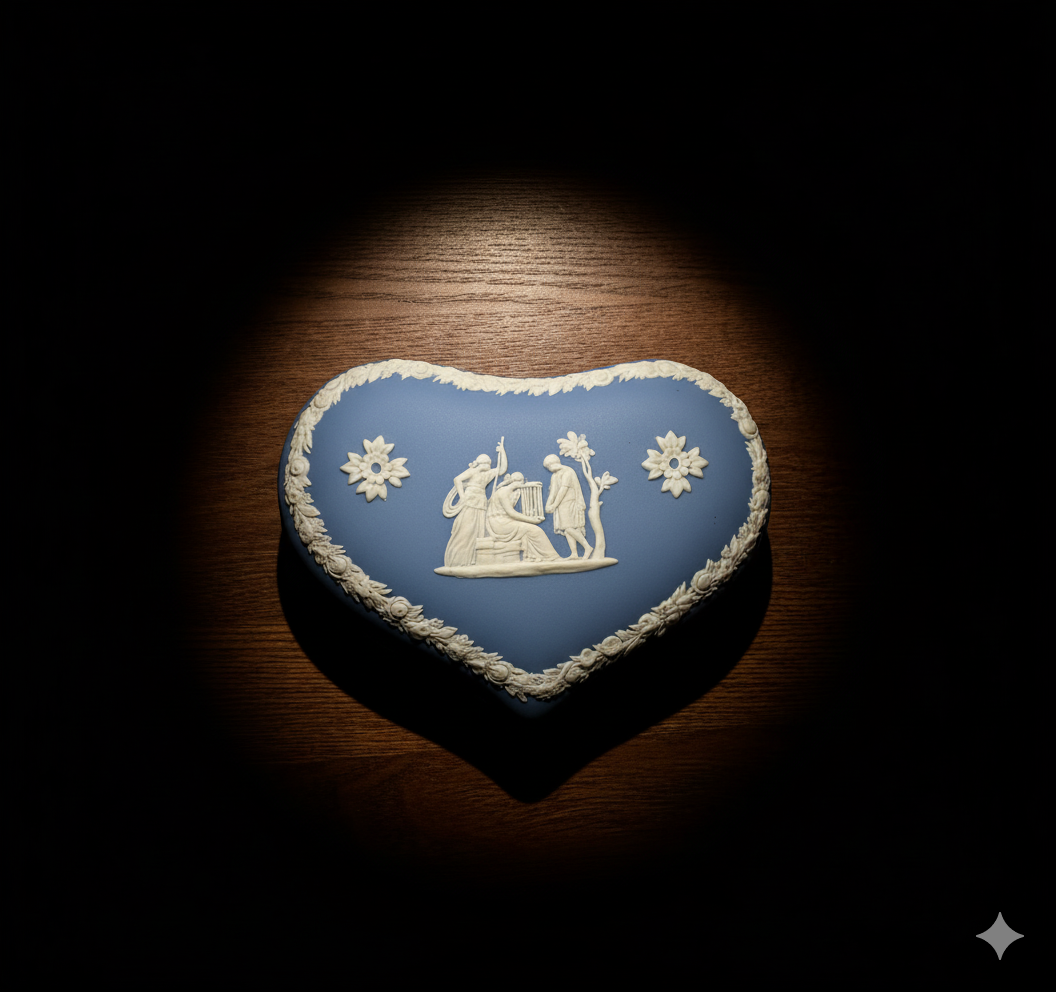 This item is a beautiful Wedgwood Jasperware trinket box in a heart shape, featuring the iconic pale blue matte stoneware body. The lid is decorated with characteristic white molded relief (sprigging), showcasing a central neoclassical scene of figures, likely Muses or gods, and is bordered by a delicate floral wreath and symmetrical accent flowers. This piece reflects Josiah Wedgwood's famous 18th-century design innovation and is a popular collectible, typically functioning as a small box for jewelry or sentimental items.